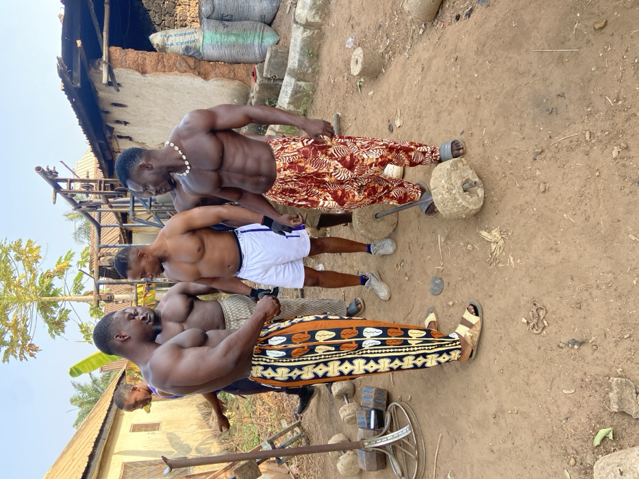 The scene depicts an outdoor gathering of five adult males in an unpaved area in Akwanga, Nigeria. The ground is reddish-brown dirt with scattered small rocks and debris. Four of the five men are shirtless, revealing muscular physiques. In the left foreground, a muscular man with dark skin stands facing right, wearing loose-fitting patterned trousers with vertical black, orange, white, and yellow geometric designs, and light brown sandals. His hands are clasped at waist level. To his right, another shirtless, muscular man in white shorts with blue side stripes and grey athletic shoes, wearing black wrist wraps, faces left. He appears to be interacting with the man in patterned trousers. To the right of the man in white shorts, a third muscular man stands facing left, wearing loose-fitting reddish-brown patterned trousers with a black and white zebra-like design, and grey sandals. He wears a white cowrie shell necklace. Behind the man in patterned trousers, a fourth shirtless, muscular man is partially visible, wearing patterned bottoms and sandals. A fifth man in a blue shirt is visible on the far left, partially obscured. Homemade weightlifting equipment is present on the ground. To the left, a metal stand supports multiple dark square weights and a circular metal component. To the right, two barbells made from round, rough-hewn concrete weights attached to metal rods are visible; one stands upright near the foot of the man in reddish-brown trousers, and another lies horizontally on the ground further right. In the background, single-story structures with weathered walls (some appearing as exposed mud-brick or rendered, one with a partial collapse) and corrugated metal roofs are visible. Against the rightmost building, several large, grey/blue woven bags (possibly cement or charcoal sacks) are stacked. A tall, slender papaya tree and banana leaves are visible in the background against a clear sky. The scene is illuminated by bright daylight.