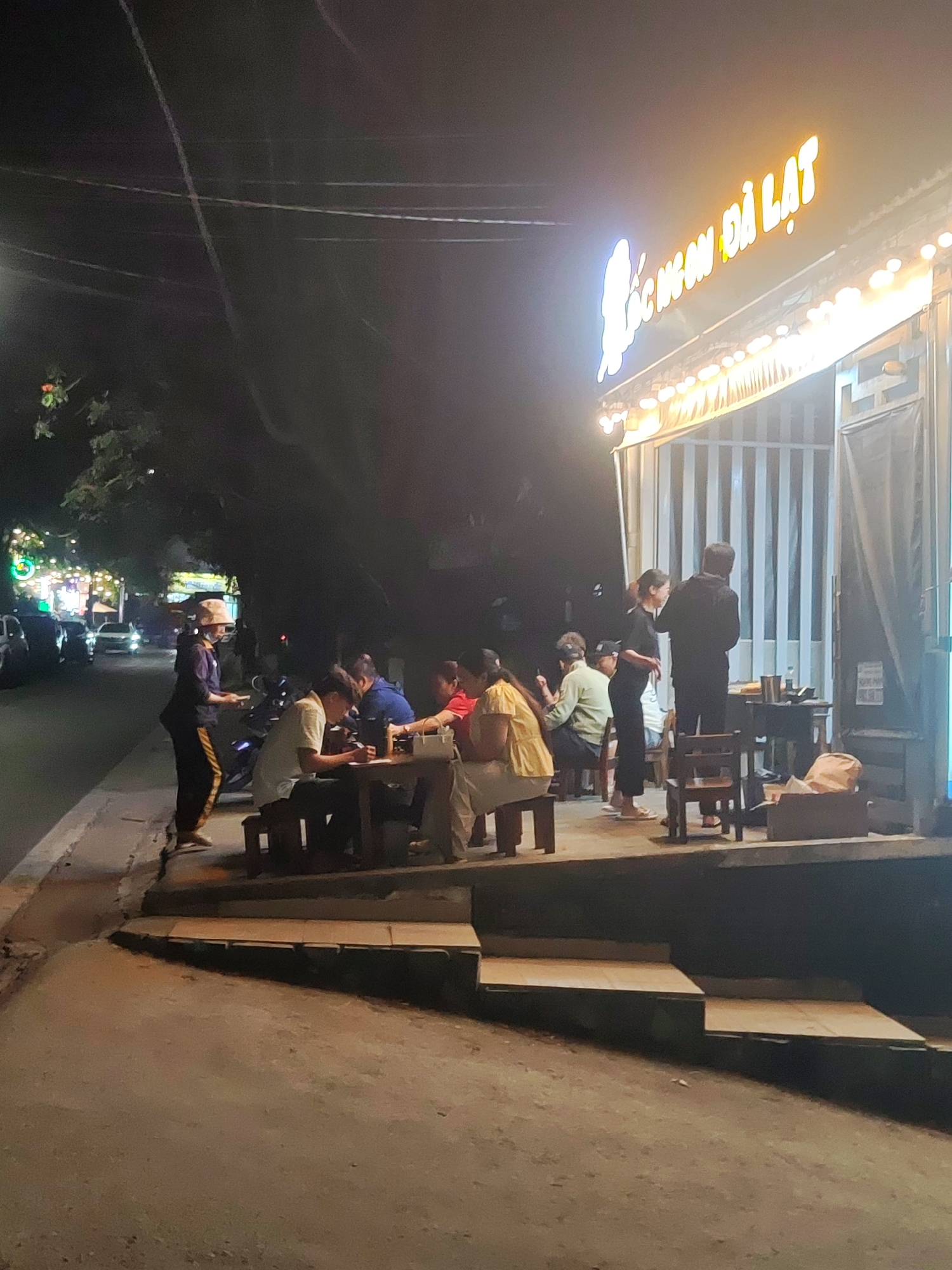 n outdoor dining area in Da Lat, Vietnam at night. Several people are seated at tables, and a server wearing a face mask and hat is taking orders or delivering food. The restaurant has a brightly lit sign that says "ỐC NGON ĐÀ LẠT". The dining area is elevated from the street, with a few steps leading up to the tables. Several cars can be seen parked or driving on the street in the background.