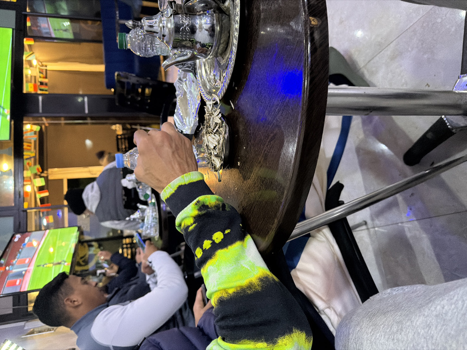 A group watches a soccer game on a TV inside a cafe or bar. A dark-haired man in a grey and white top sits closest to the camera. A person in a black and neon yellow shirt is seen reaching toward a silver teapot or ornate serving set, likely to pour a drink. The table is dark wood with a shiny finish, reflecting light. The cafe is decorated with small flags from various countries.