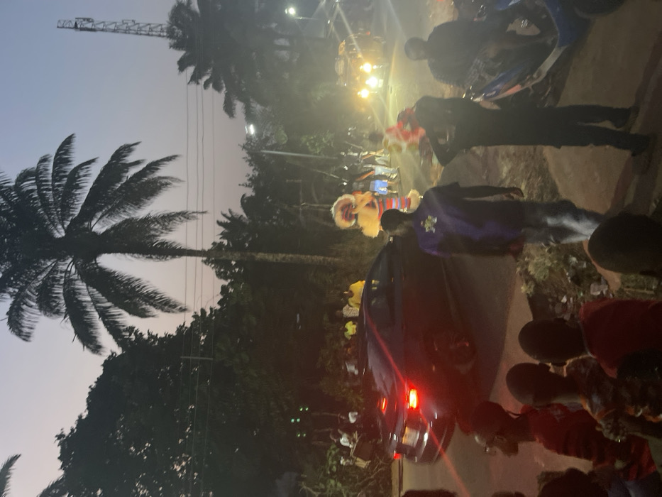 A nighttime street scene shows a lion dance performer in a colorful costume. A group of people are gathered around a dark car, some in red shirts. Tall palm trees and other foliage line the road. There's a tall metal structure in the background sky. The atmosphere is filled with the glow of streetlights.