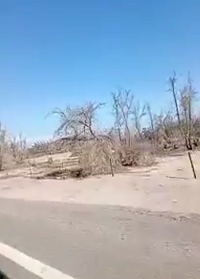 The camera is moving, presumably from inside a car. On a clear, bright day, the view shows a roadside with a desert-like environment. Several bare trees stand along the side of the road, and beyond them is a sandy area. There’s a red sign visible with some writing on it, partly obscured by a tree. The overall scene gives the impression of an arid and somewhat desolate landscape.