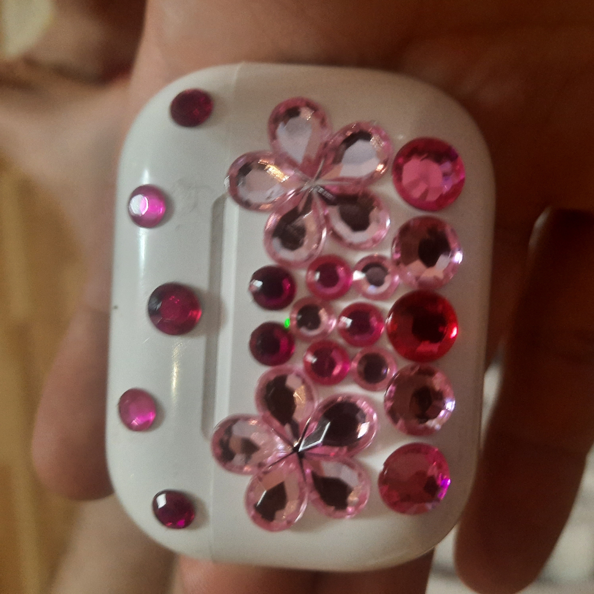 A white Apple AirPods charging case, customized with numerous faceted pink and red rhinestones, is depicted held in human hands