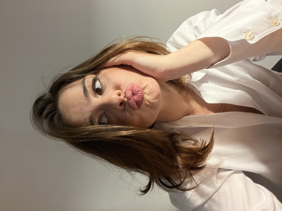 A woman with light skin, brown hair, and brown eyes is angled from the left. She is wearing a white button-down shirt. Her right hand is positioned near her cheek, and she is puckering her lips, creating a kissing face. The background appears to be a light-colored wall or surface. The image has a slightly upward tilt, contributing to an informal, selfie-like feel.
