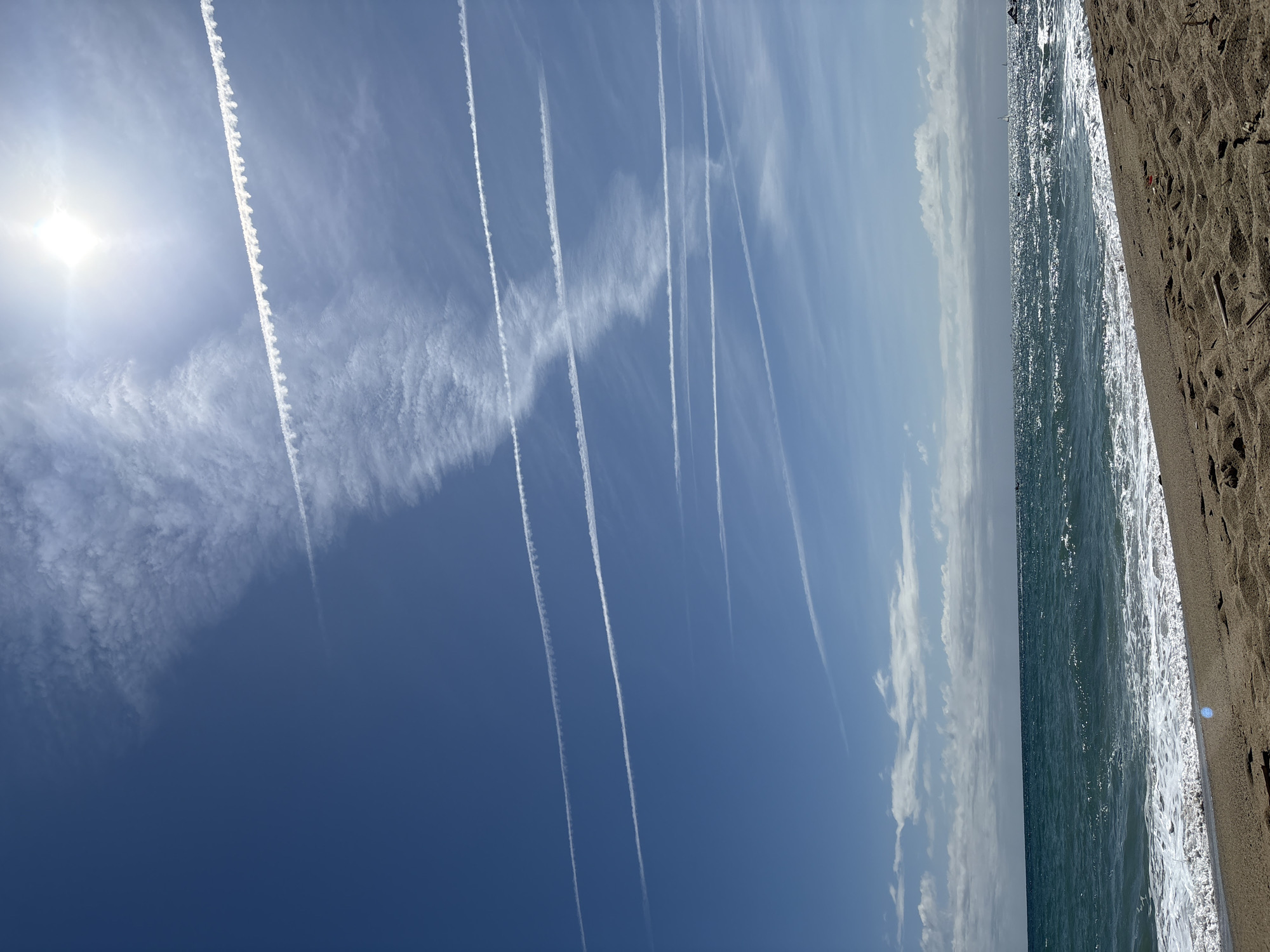 The image displays a sunny, unpopulated beach scene in Barcelona, Spain. The foreground consists of light brown sand imprinted with footprints and containing minor organic debris. The Mediterranean Sea occupies the midground, presenting turquoise and dark blue water with moderate waves breaking into white foam at the shoreline. Intense sunlight reflects off the water's surface, particularly towards the right. Faint, distant sailboats are discernible on the horizon. The background features a clear, deep blue sky, fading to lighter blue near the horizon, interspersed with scattered white cirrus clouds. The sun, a bright, overexposed white disc with a starburst flare, is located in the upper right quadrant. Multiple white aircraft contrails crisscross the sky; some are distinct linear trails, others are more diffused or exhibit a wavy pattern, with one prominent contrail intersecting another.