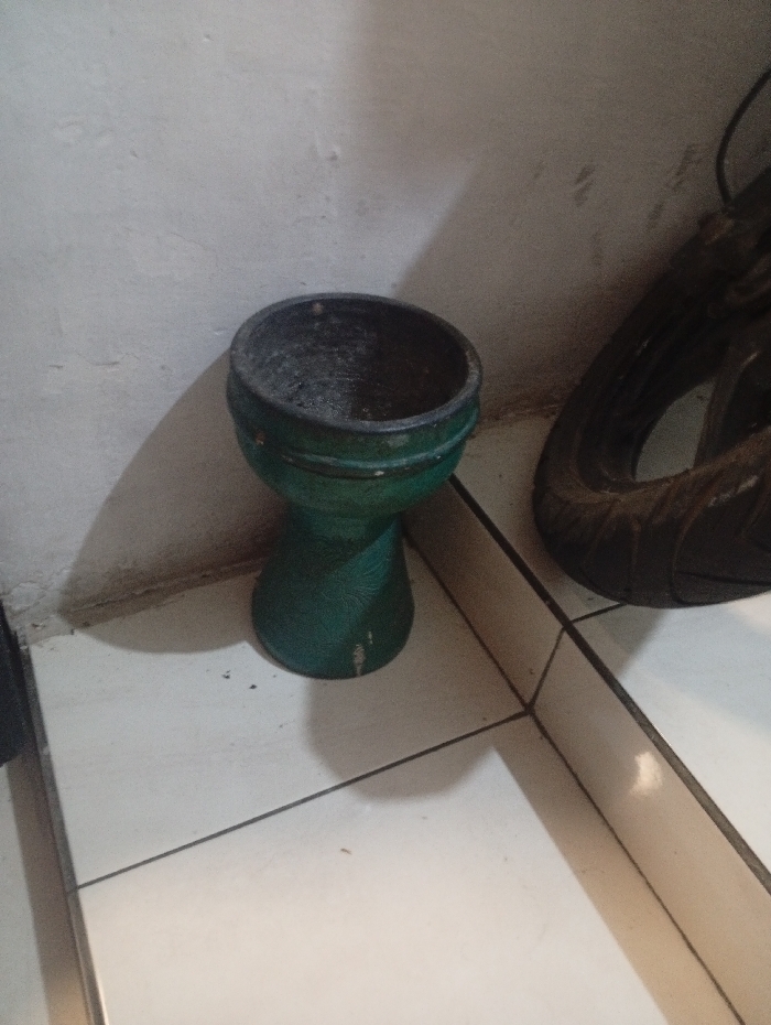 The scene is an interior corner in Margahayu Tengah, Indonesia. A dark green, goblet-shaped object, approximately 30 cm in height, rests centrally on a light-colored tiled floor. The object features a wide, dark-textured opening at the top, a tapering body with two horizontal bands, and a flared base showing minor white scuff marks. To the right, partially visible against the wall, is a segment of a dark, worn object, consistent with a tire. The floor is composed of square, light-colored tiles with dark gray grout lines. The background wall is off-white and shows surface texture and minor discoloration, particularly at its junction with the floor. A distinct shadow from the green object extends onto both the wall and the floor, indicating a light source positioned above and to the left. No individuals or active interactions are present.