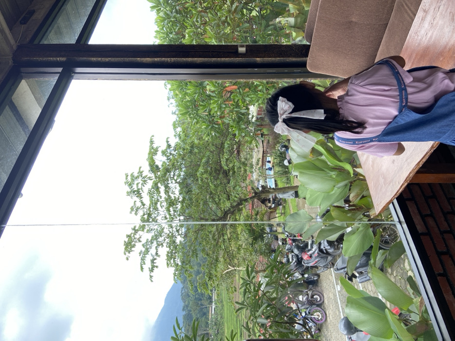 A young girl with a white bow in her hair sits at a wooden table inside a building with a large glass window. Outside the window, there is a lush green landscape with trees, a mountain in the distance, and a parking area filled with motorcycles. The girl is wearing a light pink shirt with dark blue overalls. Her clothing and hair ribbon feature a "Kuromi" pattern. The scene gives a sense of being indoors while still connected to the natural world.