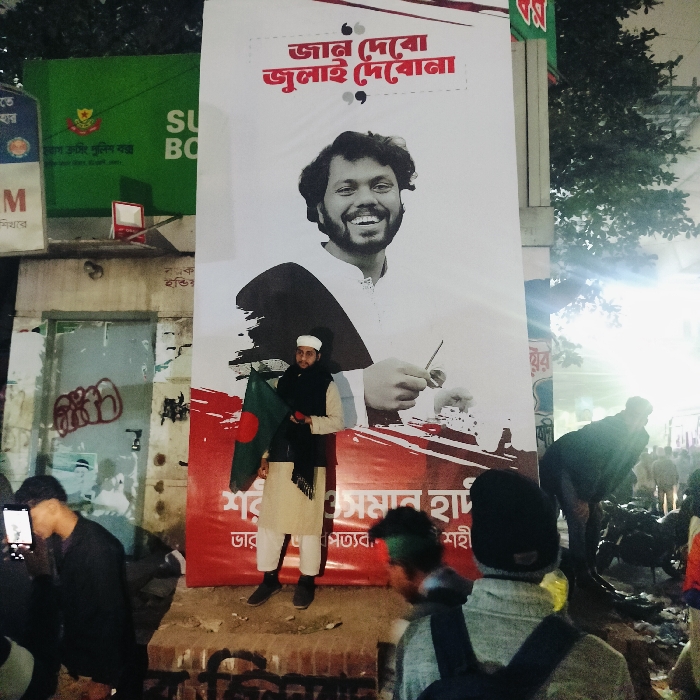 The image depicts an outdoor urban scene at night in Dhaka, Bangladesh, characterized by artificial illumination. The central focus is a large, vertical white political banner featuring a smiling man with a beard and curly hair, wearing a white traditional garment. Bengali text on the banner reads, "জান দেবো জুলাই দেবোনা" (Jan debo July debona), translating to "Will give life, but not July," followed by "শোহরাব সুমন শাহ" (Sohrab Sumon Shah) and "ছাত্র অধিকার পরিষদ" (Chhatra Odhikar Parishad - Student Rights Council). In the immediate foreground, a man wearing a light-colored tunic, dark pants, a black shawl, and a white skullcap stands facing the camera, holding a small Bangladeshi flag in his left hand and a small red object in his right. To his left, another individual, partially visible, holds a smartphone vertically, appearing to record or photograph the scene. The background to the left of the banner includes a partial green sign displaying the emblem of the "বাংলাদেশ পুলিশ" (Bangladesh Police) and the word "থানা" (Thana - Police Station), along with "SUPER BOARD" in English. Below this sign, a light blue door or shutter is covered with white graffiti. The ground in the foreground appears uneven with some debris. To the right of the banner, several blurred figures are visible, including one individual bent over and two figures with their backs to the camera in the bottom right corner, one wearing a green headband and the other a dark backpack. The scene suggests a public gathering or demonstration, likely on a street or square, adjacent to a police station.