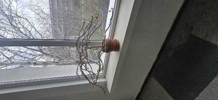 This image depicts an indoor scene facing outward through a window, located in the city of Unknown, Unknown. A potted plant with a brown terracotta-style pot and matching saucer rests centrally on a white, slightly textured window sill. The plant features numerous thin, dark, thorny branches extending outward and downward, with sparse small green leaves and a few small reddish-pink blossoms. The white window frame is visible, with a vertical mullion dissecting the outdoor view. Beyond the window, the exterior environment is overcast, revealing several deciduous trees, largely bare, suggesting late winter or early spring. A prominent tree with lighter bark stands to the left of the central window division. In the mid-ground to the right, a multi-story building with visible windows is present. The indoor foreground consists of a dark grey floor with a visible pattern of square or rectangular tiles, some appearing lighter due to wear or lighting. A dark, thin line marks the transition from the floor to the light grey wall beneath the window sill. No individuals, actions, or interactions are present in the scene.
