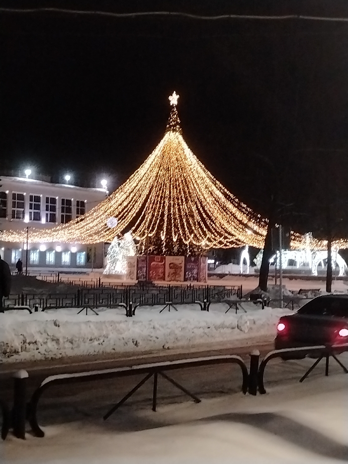 This image depicts a snow-covered urban square in Chaikovsky, Perm Krai, Russia, likely the central public square (such as Komsomolskaya Square or the area near the House of Culture "Energia"), at night during winter. The central subject is a large, brightly illuminated, cone-shaped artificial Christmas tree adorned with numerous golden-yellow string lights, culminating in a prominent star at its apex. These string lights extend outwards from the tree, forming a canopy over the square. At the base of the main tree is a circular structure with multiple panels displaying colorful, artistic, likely festive, illustrations. To the left of the main tree, a smaller, white, illuminated tree or abstract light sculpture stands on the snow. Further right in the background, additional illuminated arched structures are visible. The ground is covered in a thick layer of undisturbed white snow. A dark-colored, snow-dusted metal fence-like barrier runs across the mid-ground, separating a foreground pathway from the main festive display. Several dark, low-level bollards are positioned along this pathway. In the far background on the left, a multi-story, light-colored building with a flat roof and numerous illuminated windows is visible. Small light fixtures are present on its roof. Two indistinct human figures are visible near this building, partially obscured. On the far right, the rear section of a dark-colored passenger vehicle with illuminated red taillights is partially visible on what appears to be a street or access road. Dark, bare trees are partially visible on the right side of the frame. The sky is completely dark, indicating nighttime.