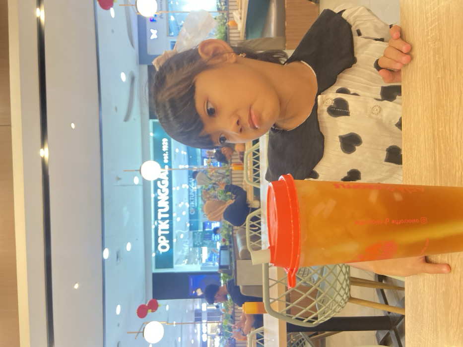 - "A young girl is seated at a light-colored wooden table in an indoor commercial setting, identified by the prominent "OPTIK TUNGGAL est" by FM-htxI33, licensed under CC BY 4.0