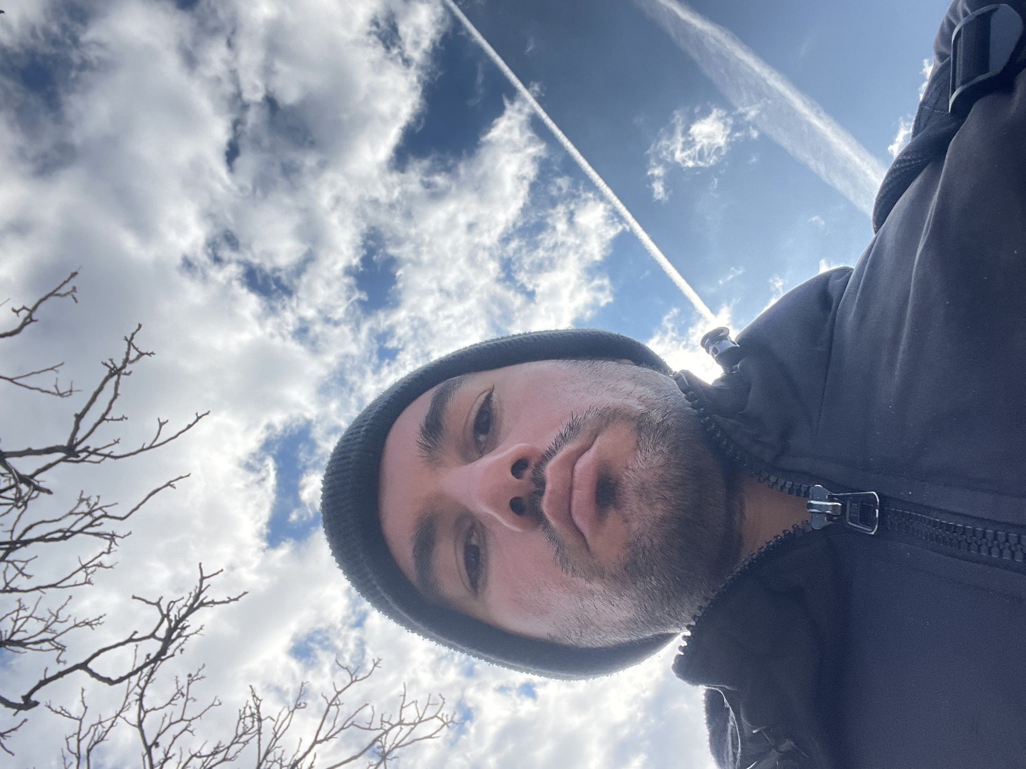 An adult male is depicted in an upward-angled outdoor selfie, taken in Lesidren, Bulgaria. The subject is positioned centrally, showing his upper torso, face, and head. He is wearing a dark knit beanie and a dark zippered jacket, with the prominent zipper and pull tab visible on his chest. He has dark eyebrows and short facial hair, with a neutral expression and slightly pursed lips. The background features a partly cloudy sky, displaying patches of blue amidst white clouds. Bare tree branches are visible in the upper left quadrant, silhouetted against the sky. A distinct, straight white contrail from an aircraft diagonally traverses the upper right portion of the sky, with another less defined contrail visible further left. The scene is brightly illuminated by natural light.