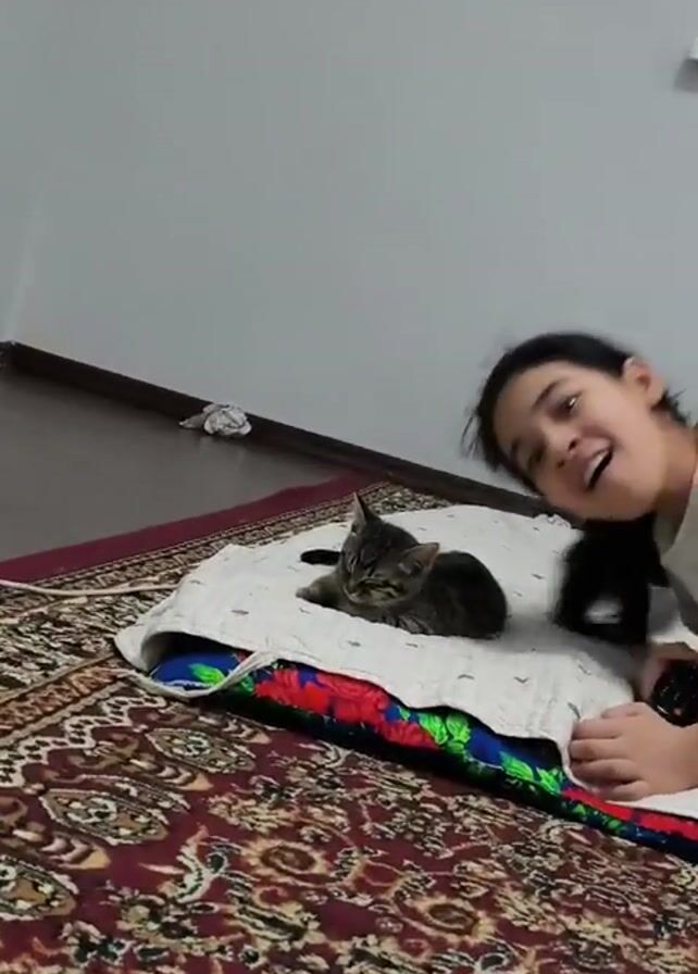 A young girl is sitting on a patterned rug in a room with a light brown-wood floor, white walls, and a window to the right side of the frame. A tabby kitten lies curled on a small, stack of colorful bedding in front of her. The girl appears to be talking to or about the cat. The camera zooms in on the cat. At one point, the girl leans closer to the cat and into the frame, obscuring the left side of the image with her hair and face.