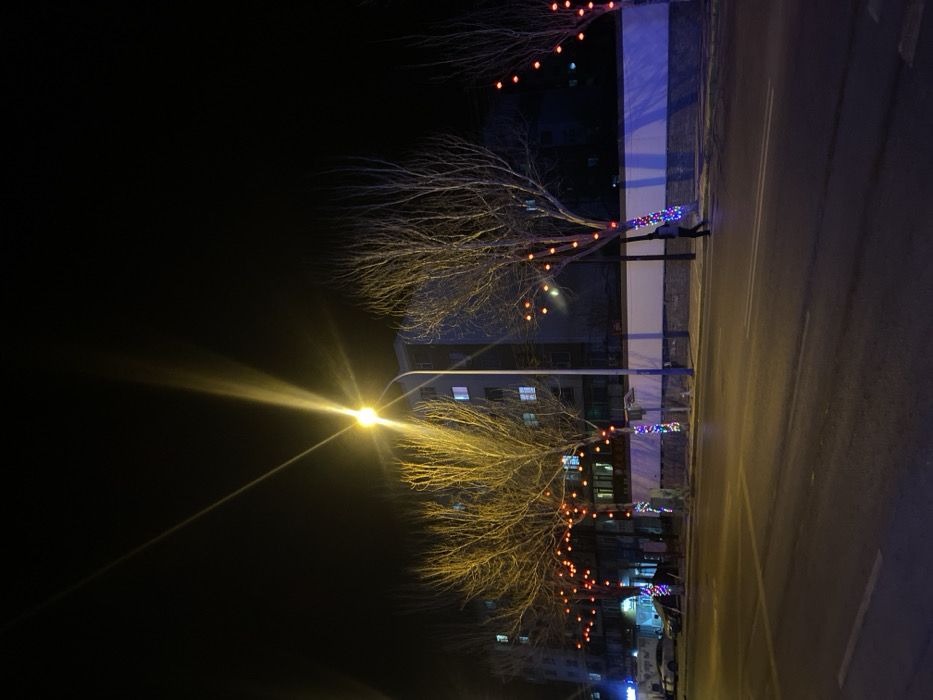 This image depicts a nighttime street scene in Zhongtun, China. A broad, dark asphalt road, possibly wet or reflective, occupies the foreground and midground, with faint lighter markings. On the left side of the road, several parked vehicles are visible in the distance, under the cover of trees and adjacent to multi-story buildings with illuminated windows. A prominent streetlamp, positioned centrally, emits a bright yellow light with a distinct starburst lens flare extending upwards and to the left. This streetlamp illuminates the bare, deciduous trees lining the street. The trees on the left appear golden due to the streetlamp's light, while trees further to the right are less intensely lit. Several trees are decorated with strings of red spherical lights, and their lower trunks are wrapped with multi-colored festive lights. Behind the trees, a long, light-colored wall or fence runs parallel to the street. A blue light casts a glow onto sections of this wall. In the midground, to the right, a solitary individual is seen walking away from the camera, near the decorated trees and the wall. The background consists of dark sky and the outlines of additional buildings with some lit windows. The overall environment is urban, illuminated by artificial light sources.