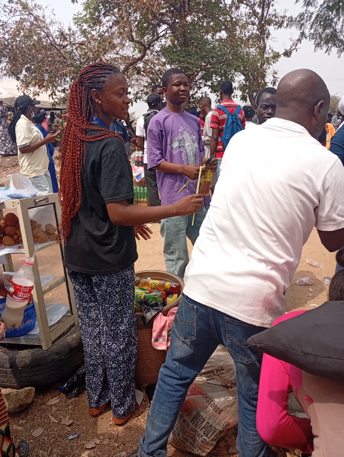 The image depicts an outdoor, crowded scene in Adankolo, Nigeria, possibly a market or informal gathering area, under a bright, likely sunny, sky. The ground is dry earth with scattered debris. In the foreground left, a female with dark skin and long, reddish-brown braided hair stands, facing towards the right. She wears a black t-shirt and blue patterned trousers with brown shoes. Her left hand is raised in a communicative gesture. To her left is a makeshift vendor stand: a metal-framed structure with multiple shelves displaying round, fried food items. Adjacent to this stand, an empty car tire supports a blue plastic basket containing a plastic bottle of Fanta, filled with a light-colored liquid, possibly a local beverage. To the right of the female vendor, a male with dark skin and short hair wears a purple t-shirt featuring a white graphic, blue jeans, and holds a small, dark object with yellow strips in his right hand. He looks towards the right. In the immediate foreground right, a bald male with dark skin, wearing a white t-shirt and blue jeans, has his back mostly to the camera. He is bending forward, indicating interaction with something or someone lower in the frame, partially obscured by a person in a pink top with a black object on their head. Below him are white polypropylene bags, one with "VIVA POLY BAGS" text visible. A brown woven basket containing various colorful items, possibly packaged goods, sits between the female vendor and the bending male. In the background, numerous indistinct individuals are visible, suggesting a busy public space. Sparse trees with dry leaves are overhead.