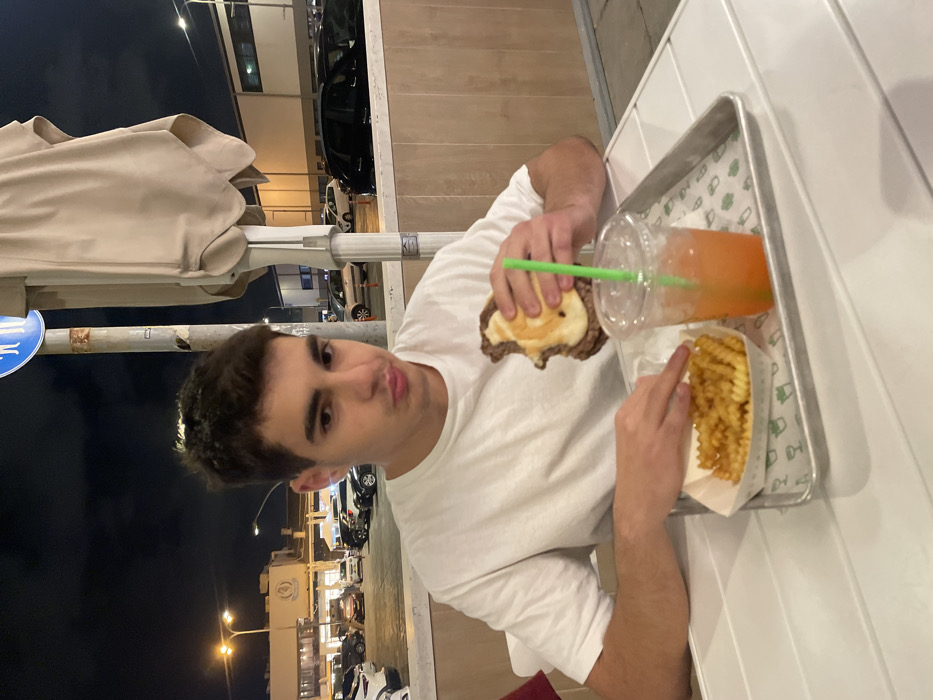 A young male, approximately 18-25 years old, with short dark hair, wears a white t-shirt and is seated at a white slatted outdoor table at night. He holds a partially consumed burger with a beef patty and cheese in his right hand. His left hand rests near a white paper boat filled with golden crinkle-cut fries, which are placed on a silver tray. The tray also holds a clear plastic cup with a dome lid and a green straw, containing an orange-colored beverage. The tray's paper liner displays repetitive green logos, consistent with Shake Shack branding. The male's lips are slightly pursed, and his gaze is directed towards the viewer's right. A portion of another individual's arm, wearing a red shirt, is visible on the far left. The background shows a dark night sky illuminated by streetlights. Parked vehicles are visible, and buildings consistent with an urban commercial district line the street. On the left, a light-colored building displays what appears to be a "3" on its facade. On the right, a darker building features horizontal paneling. A vertical metal pole in the mid-ground supports a blue circular sign with a white pedestrian icon and a folded beige outdoor umbrella. A low, light-colored barrier or wall separates the dining area from the background environment. The scene takes place in an outdoor dining area, likely a fast-casual restaurant patio, in an unknown city, unknown country.