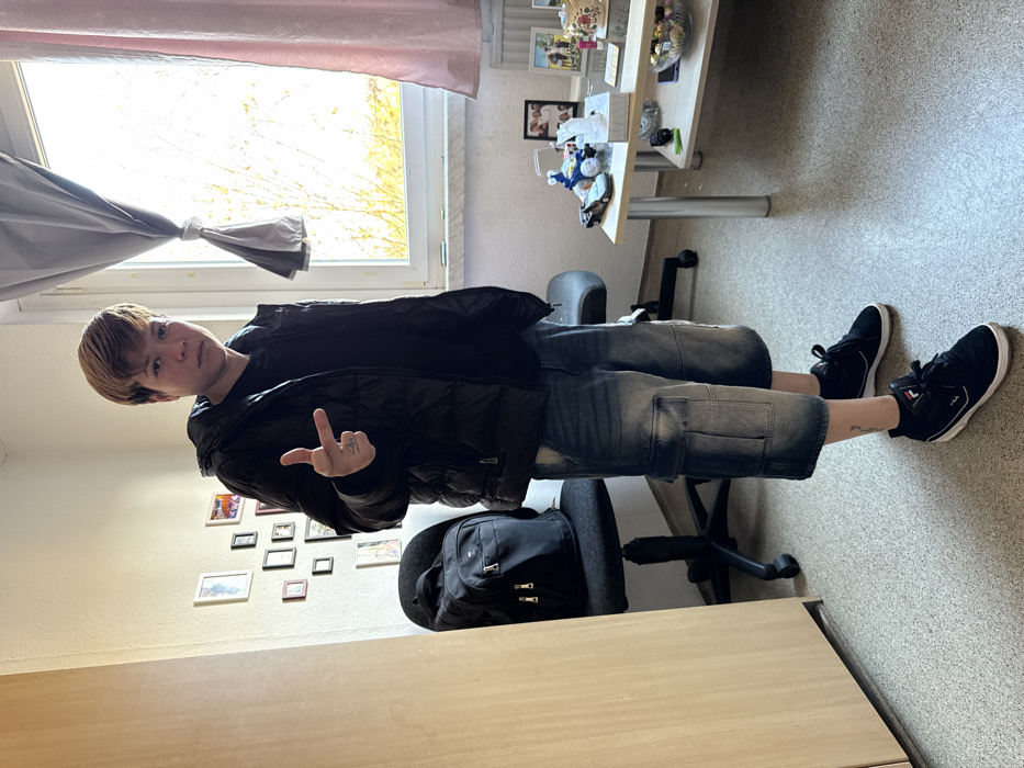 The scene depicts an individual standing in an indoor residential room. The person, an adult with short, light brown hair, is positioned centrally and faces directly forward, making eye contact with the viewer. They are dressed in a black puffer jacket over a dark shirt, blue denim cargo shorts, and black Fila sneakers with white soles. A small tattoo is visible on the inner right forearm/wrist. The right hand is raised, with the index finger and thumb extended in a specific gesture, while the other fingers are curled. To the left of the individual, a light wood-colored wardrobe or cabinet is partially visible. A black office chair, equipped with a black backpack, is situated in front of a wall adorned with an arrangement of various framed photographs. To the right of the individual, a large window with white framing provides ample natural light to the room. Bare tree branches are discernible outside the window, indicating an outdoor natural setting. Grey and pink curtains are tied back, flanking the window. Adjacent to the window, a light-colored table with metallic legs displays several items: a white tissue box, multiple framed photographs, a small blue toy figure, a black toy car, a black electronic device, and a bowl containing various small, colorful objects. The flooring of the room is a light grey, textured material. The walls are light cream or off-white. The location is an indoor room; no specific external geographical markers for the city of Dresden, Germany, are visible within the image to confirm this location.