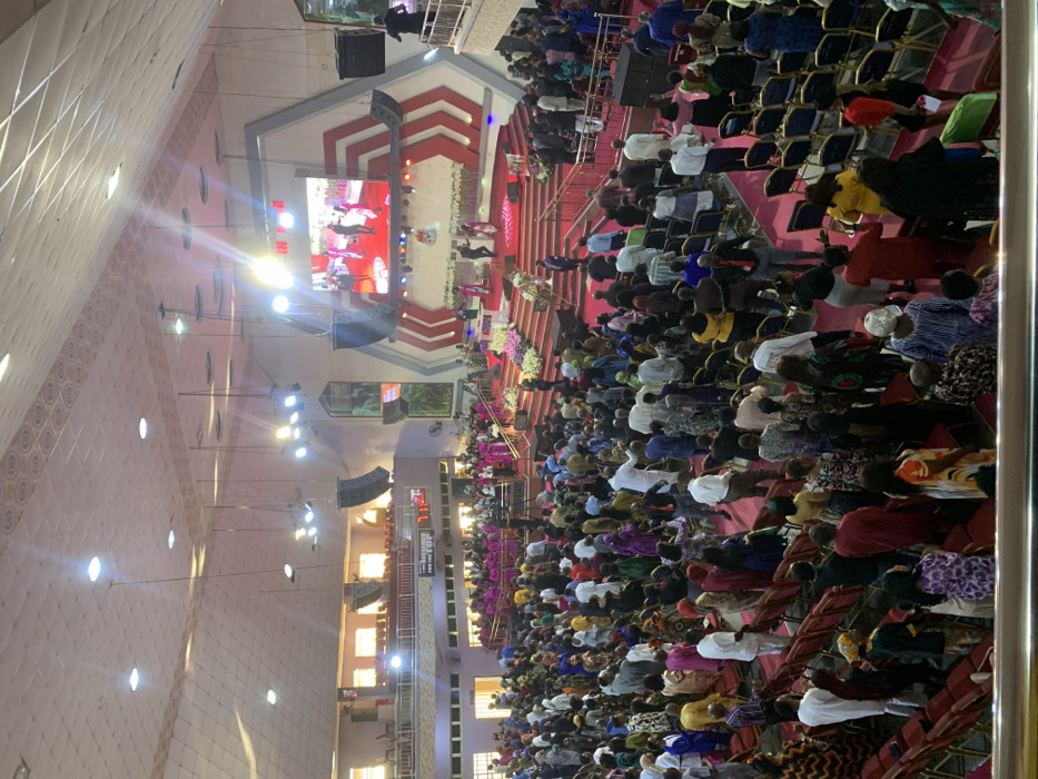 The image depicts the interior of a large auditorium or church, specifically in Sabon Gari West, Nigeria