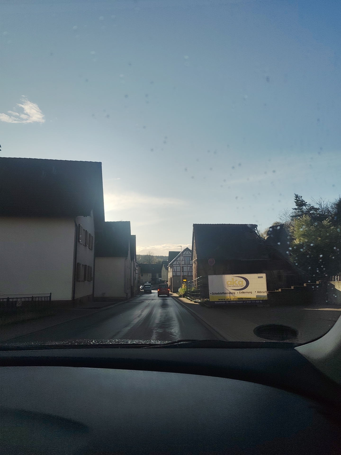 The image captures a street view from inside a vehicle, looking forward through a windshield covered in water droplets or imperfections. The scene depicts a street in Hausen, Germany, identified by a prominent banner displaying the address "Hauptstraße 29 • 63840 Hausen." The sky is clear blue with sparse white clouds, and the sun appears low in the sky, creating glare towards the horizon and reflecting off the visibly wet asphalt road. On the left side of the street, a continuous row of multi-story buildings with light-colored facades and dark-tiled roofs stands. Some windows feature dark shutters. On the right, closer to the foreground, a large white banner for "aka Dienstleistungen" is visible, advertising "Schadstoffsanierung • Entkernung • Abbruch" (Hazardous waste remediation • Gutting • Demolition), along with their website and phone number. Behind this banner is a building with a dark roof. Further down the street on the right, a traditional half-timbered house is discernible. Trees and other vegetation are visible beyond the buildings on both sides. Several vehicles are present in the distance on the wet road, moving away from the viewer: a dark-colored sedan is followed by a red compact SUV. No pedestrians are visible on the street. The vehicle's dashboard occupies the bottom portion of the frame.