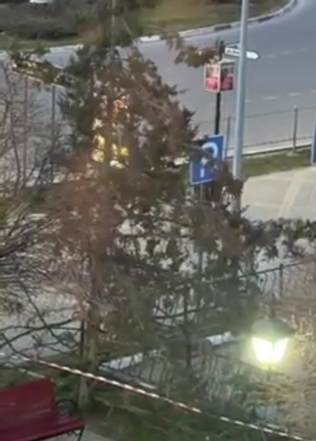 The scene shows an exterior view, possibly from an elevated position such as a window. There are trees and shrubs with bare branches suggesting it is likely late fall or winter. A small evergreen tree stands near a lamppost and a blue parking sign with a white "P". Red and white barrier tape stretches across the ground, partially surrounding the tree. A red bench is visible in the lower left corner. In the background, there is a street with light traffic, a roundabout, and another sign. The video appears to be shot through a window, as reflections are visible.