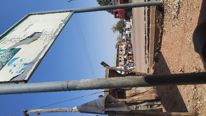 This image depicts a sunlit street scene in Panshekara, Nigeria. In the immediate foreground, a weathered grey metal utility pole stands centrally, casting a shadow to its right. To the left of the pole, a partial view of a makeshift structure constructed from rusted corrugated metal sheets and wooden supports is visible. A piece of torn white fabric hangs near this structure. The ground in the foreground consists of reddish-brown earth with scattered debris and sparse dry vegetation, exhibiting strong shadows indicative of bright sunlight. Across the midground, a paved road extends horizontally, populated by numerous individuals, vehicles, and structures. On the left side of the road, a cluster of low-rise commercial buildings with various architectural styles, some featuring green roofs, line the street. A significant number of pedestrians are present, engaging in various unidentifiable activities, with a concentration of motorcycles and tricycles (keke napeps) parked or in motion. On the right side of the road, a red dump truck is prominently visible, alongside other lighter-colored vehicles further down the street. Utility lines are stretched across the midground sky. The background features a clear, bright blue sky devoid of clouds, with distant trees visible above the buildings. In the upper right quadrant, a large, rectangular billboard or sign is angled into the frame. Its surface is light-colored, heavily weathered, with significant portions of its graphic content and paint peeling and faded.