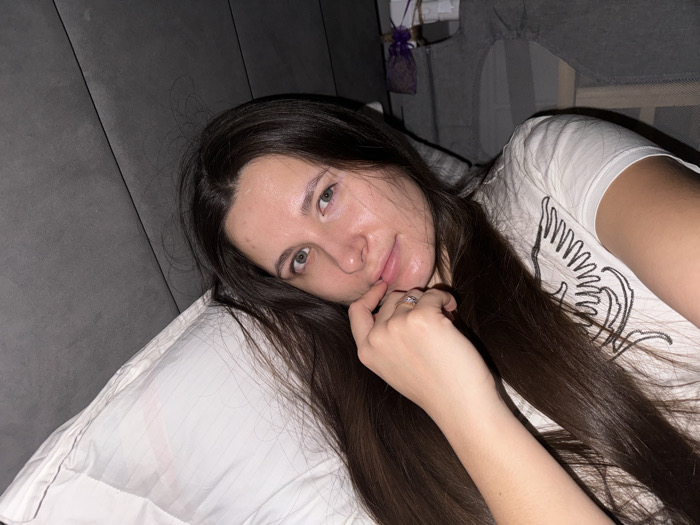 A young woman with long, dark brown hair reclines on a white pillow against a gray headboard