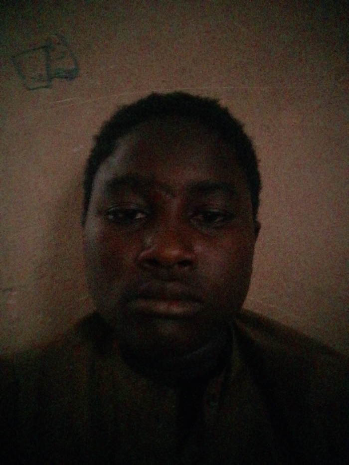 A dark-skinned person is centered in the image, their face filling most of the frame. The lighting is dim, casting shadows across their features. Their expression appears neutral. Short, dark hair frames their face. The background is a blurry wall with an indiscernible mark in the upper left corner. A dark, solid shape, possibly clothing, is visible below the chin. The low light conditions reduce the detail and clarity of the image.
