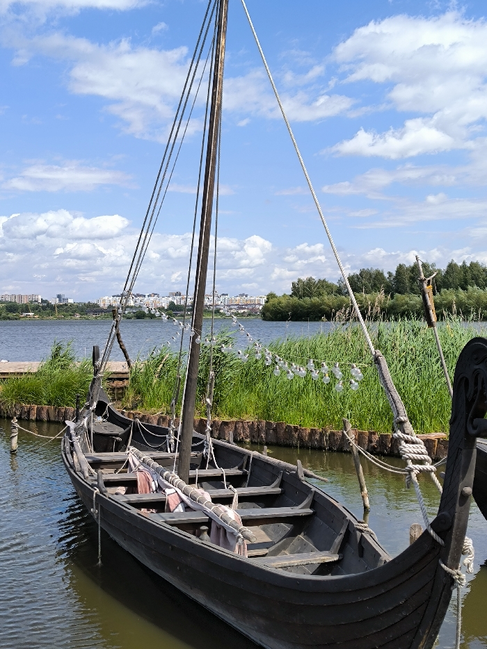 A black Viking ship rests in calm water, secured to a wooden dock lined with tall green reeds. A central mast rises against a blue sky dotted with fluffy white clouds. The ship's design includes a decorative prow. In the background, a cityscape is visible across the water, nestled between green trees. A string of decorative lights hangs between the boats.