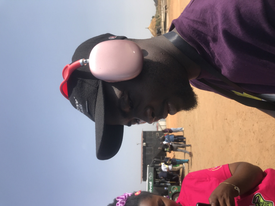 A close-up shot shows a man wearing a purple shirt, black cap, and pink headphones, looking down. The background features a group of people near a bus with green branding on a sandy terrain, beneath a clear sky. The bottom of the image shows a woman in a pink shirt with a decorative headband.