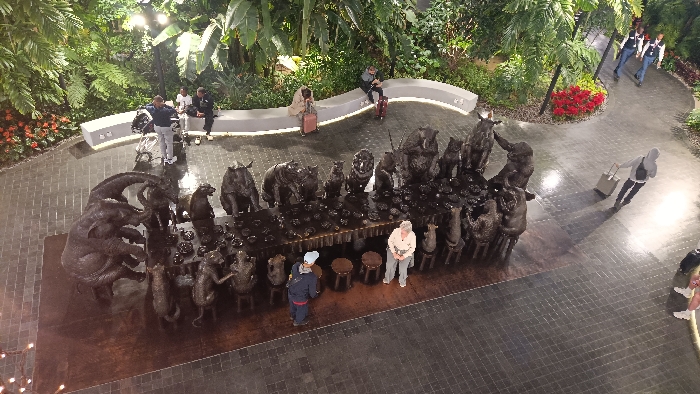 An elevated shot captures a scene with a large, dark sculpture dominating the view, possibly depicting animals seated around a table. The sculpture is surrounded by lush greenery and scattered people. Some individuals are seated on a light-colored, curved bench, while others are walking with luggage. Stools line the sides of the sculpture, and people are standing near it, including one wearing a blue hat. The background suggests an indoor garden or atrium setting.