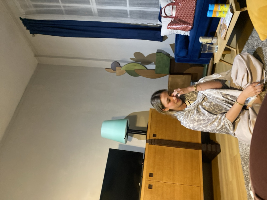 A woman sits cross-legged on the floor in front of a wooden cabinet and TV. She's wearing a patterned scarf and several gold bracelets, with her hand near her eye. Behind her are abstract wooden sculptures, a blue velvet couch with a red bag, and a small table with drinks. The room has a long, off-white wall and a window covered by sheer curtains and a blue drape.