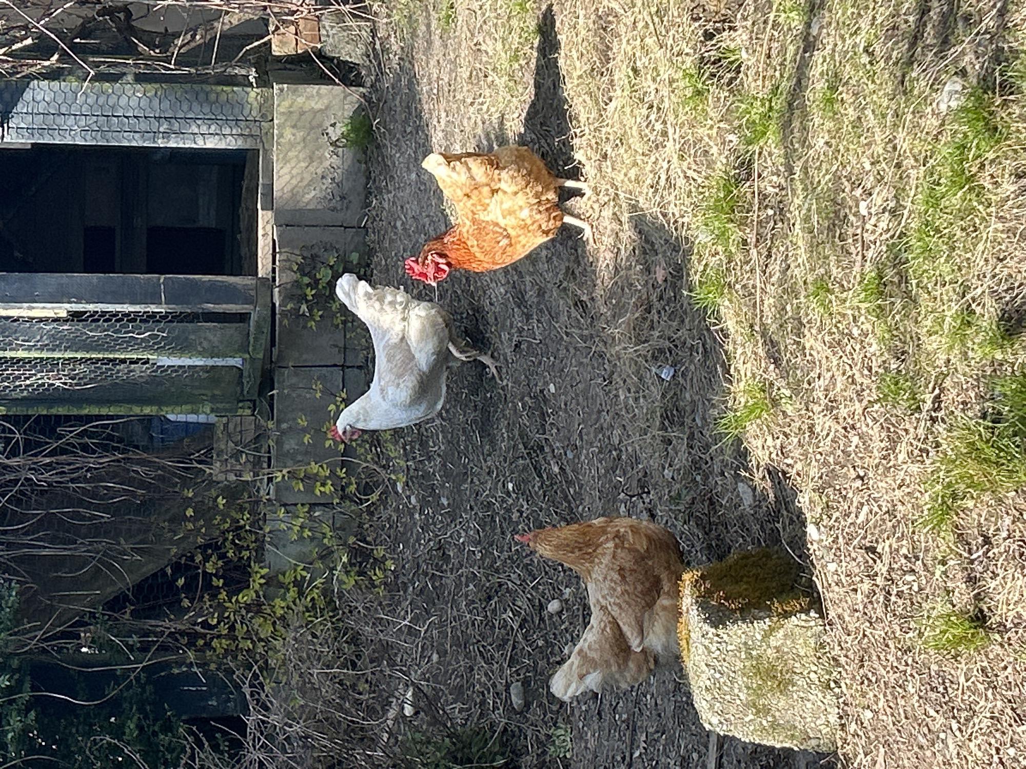 three chickens in a yard with a chicken coop. One chicken is white, two are brown. The ground is covered in dry grass and some green patches. The chicken coop is made of stone and wire mesh. The image appears to be taken outdoors during daylight, but there is no strong indicator that the location is Vancouver, Canada.