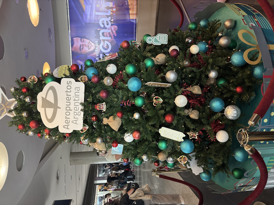 A Christmas tree stands adorned with colorful ornaments in an airport. The tree features red, blue, green, and silver baubles, along with burlap sacks and star decorations. A large "Aeropuertos Argentina" sign is prominently displayed on the tree. A velvet rope barrier surrounds the tree, and people are visible in the background near a boarding area. An advertisement is mounted on the wall in the background.