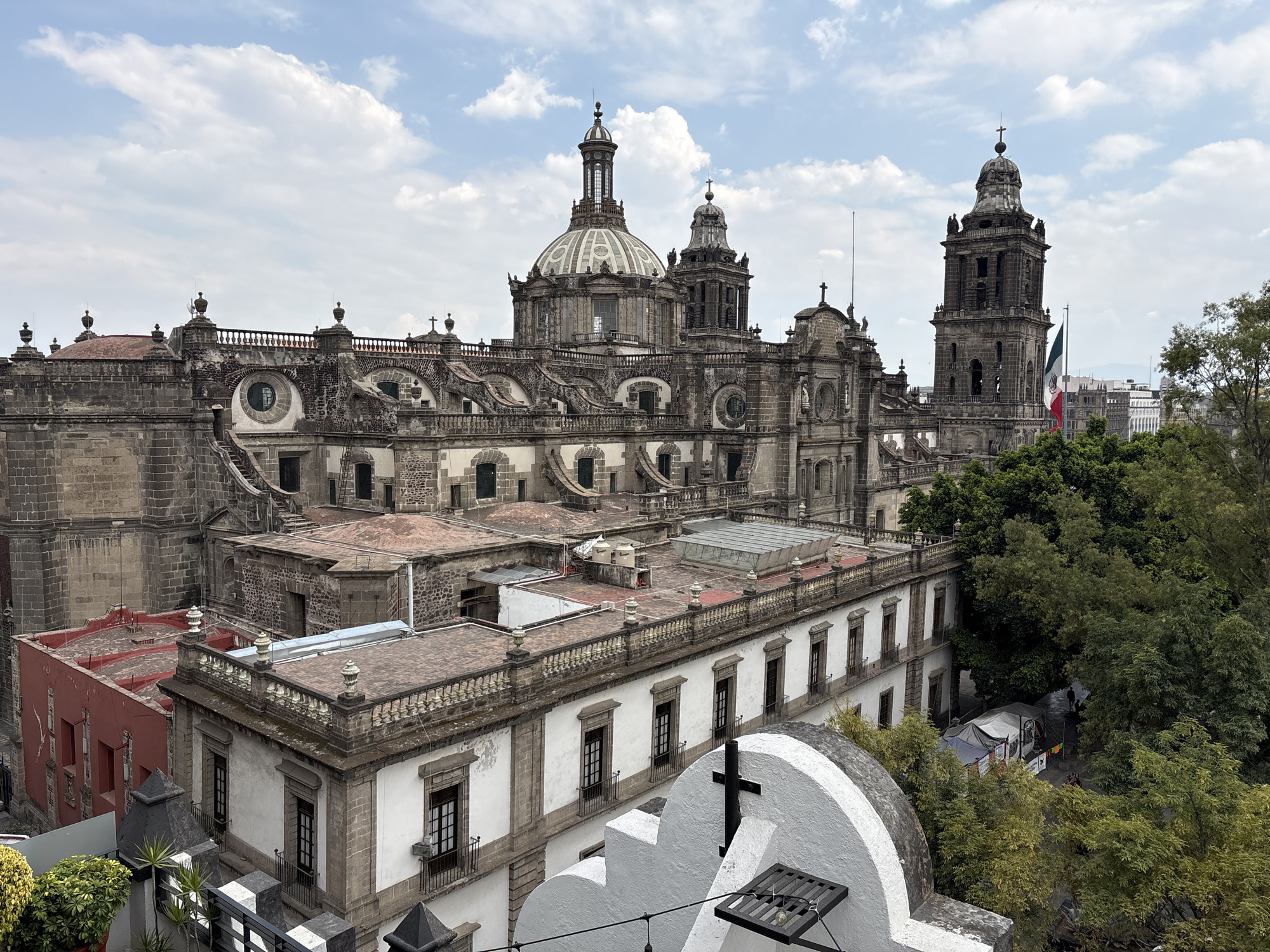 Metropolitan Cathedral in Mexico City, Mexico. The view is from a high vantage point, looking down on the cathedral and the surrounding buildings. The cathedral is a large, ornate building with multiple domes, towers, and spires. The facade is made of gray stone and features many windows and sculptures. In the background, there is a flag of Mexico and other buildings. The sky is partly cloudy. There are also green trees. In the foreground there is a white wall with a black cross.
