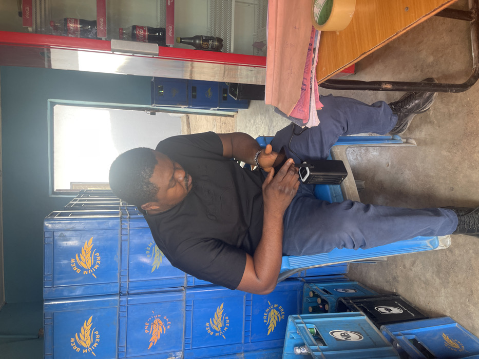 An adult male is seated on a light blue plastic chair inside what appears to be a beverage sales point in Jos, Nigeria