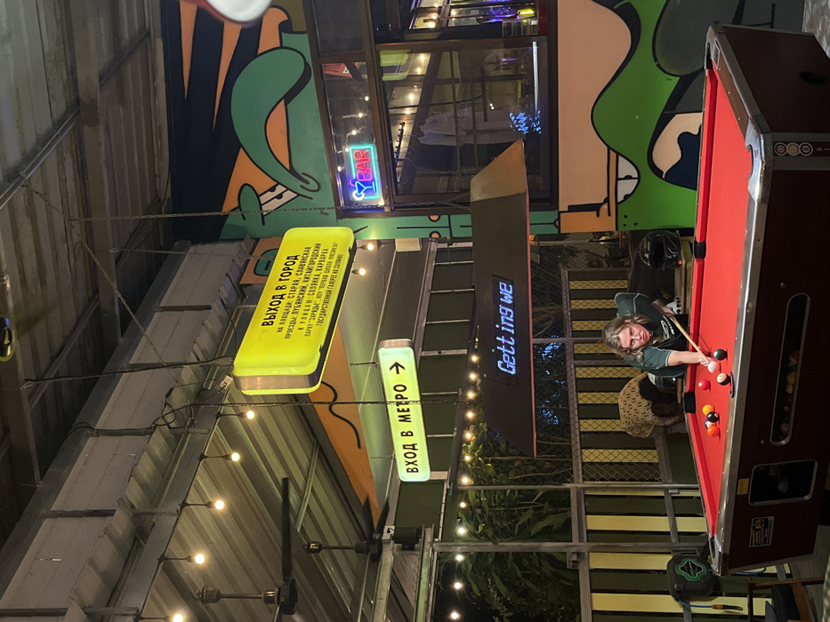 The image captures an indoor/outdoor entertainment venue in Moo 7, Thailand, during nighttime hours. A female individual with light brown hair and glasses, wearing a dark green long-sleeved shirt, is actively leaning over a red-felt pool table. She holds a pool cue, poised to strike the white cue ball towards a cluster of colored pool balls, including solids and stripes, with the 8-ball visible. Suspended directly above the pool table is a black rectangular sign with white LED text reading "Getting we". Higher in the frame, two additional signs hang from the ceiling: an upper yellow rectangular sign displaying Russian text, primarily "ВЫХОД В ГОРОД" (Exit to City) followed by a list of Moscow locations such as "площади, Старая, Славянская" (Square, Old, Slavonic) and "Лубянский, Китайгородский" (Lubyansky, Kitaygorodsky); below it, a smaller white sign shows "ВХОД В МЕТРО" (Entrance to Metro) with a right-pointing arrow. The overhead structure features a corrugated metal roof with exposed supports, from which string lights and a ceiling fan are suspended. To the right, a wall displays a vibrant mural depicting a stylized green and orange creature. A window within this wall reveals a blue neon sign shaped like a cocktail glass with the text "Y BAR". In the background behind the pool player, a metal grid fence separates the foreground from dense green foliage. A black motorcycle helmet rests on a wooden surface to the right of the pool table, and a patterned item is draped over a chair or object further back. The scene is illuminated by ambient and localized lighting.