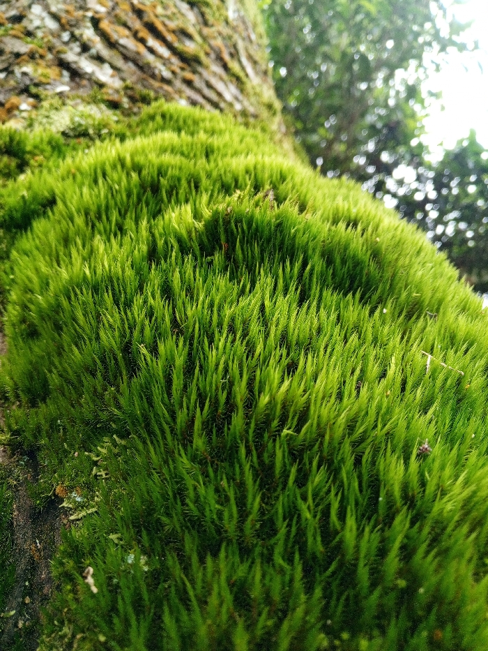 - "This image depicts a close-up, upward-angled view of a dense, vibrant green moss colony growing on the bark of a tree trunk" by FM-LiKrb2, licensed under CC BY 4.0