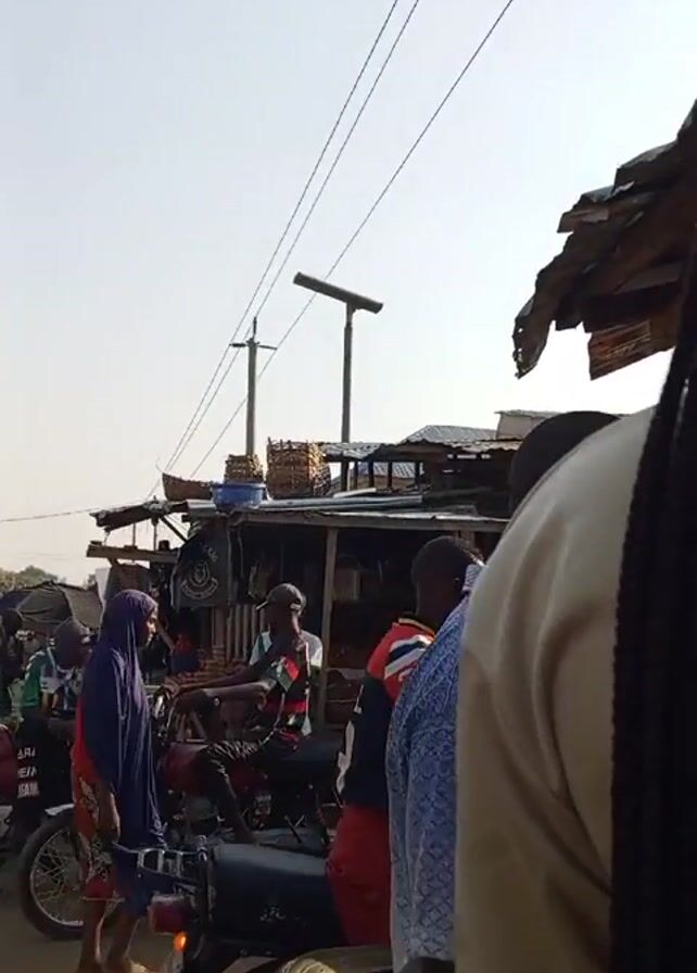 bustling outdoor market in what appears to be a developing country. Several people are visible, many of whom are wearing traditional or modest clothing. There is a woman in a hijab carrying a child on her back, while another is wearing a headscarf. Several men are present, some are wearing Western-style clothing such as T-shirts and pants, while others are in more traditional garments. Several motorcycles are parked on the side of a dirt road, some of which are stacked with tires. The market stalls are built with basic materials like wood and corrugated metal. Power lines stretch across the sky overhead. The overall scene suggests a vibrant, crowded marketplace with a mix of traditional and modern elements.