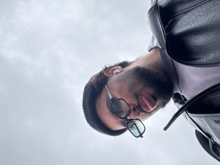 A low-angle selfie captures an adult male outdoors in Moreira, Portugal, under an overcast sky. The individual, positioned in the lower half of the frame, wears a black knitted beanie and dark-framed eyeglasses with lightly tinted lenses. A short beard and mustache frame his mouth, from which his tongue is extended. A white wireless earbud is visible in his right ear. He is dressed in a dark, possibly black, leather jacket with a zippered front, worn over a light grey or lavender high-neck shirt. The background consists solely of a uniformly cloudy, light grey sky.