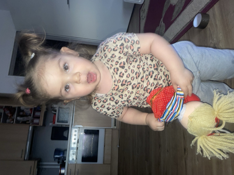 The image depicts a domestic interior, unidentifiable to a specific location within the city of Senden, Germany from visual evidence alone. A young child, appearing approximately two to three years old, stands centrally in the frame, directly facing the camera with an open mouth. The child has light skin, dark eyes, and light brown hair styled into two high pigtails, each secured with a pink elastic band. They are wearing a short-sleeved, tan-colored t-shirt with a dark leopard print pattern and light grey sweatpants. In both hands, the child holds a fabric doll. The doll features a light-toned head, yellow yarn hair styled in pigtails, a red polka-dot top, and a lower body composed of multi-colored horizontal stripes (red, blue, green, yellow, white). The background on the left half of the image reveals a kitchen area. Visible elements include light-colored wooden upper and lower cabinets, a white freestanding electric oven/stove with a visible control panel, and a dark rectangular object resting on the countertop above the oven. An upper cabinet on the far left is open, displaying various stored items. The flooring throughout the visible area is dark wood-look laminate or tile. On the right side of the frame, a section of a dark burgundy and brown geometric patterned rug is partially visible on the floor, next to a small, dark cylindrical object.