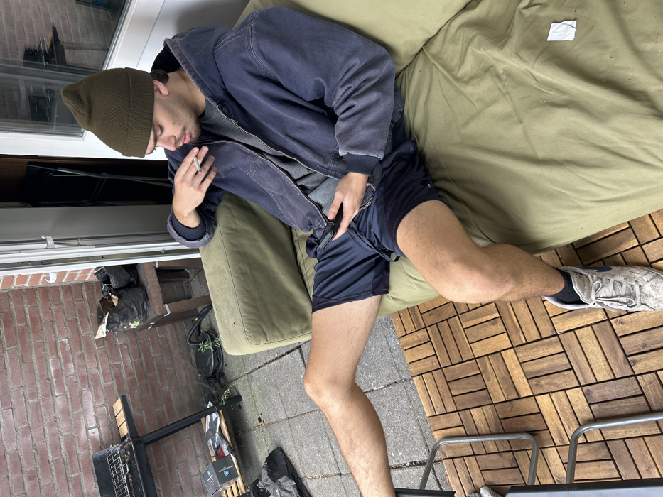 The image displays an outdoor patio or balcony in Eindhoven, Netherlands. A single individual, appearing male, is seated on an olive green fabric sofa. The person wears a dark olive green beanie, a dark blue hooded zip-up jacket over a grey t-shirt, dark blue shorts, black socks, and light-colored athletic shoes. They hold a lit cigarette in their right hand, positioned near their mouth, and a dark-colored smartphone in their left hand, resting on their lap. The individual's left leg is extended towards the left foreground, partially obscured by a silver-colored metal object, while the right leg is bent. The flooring beneath the sofa and the individual's right leg consists of light brown wooden deck tiles arranged in a grid pattern. To the left, the ground is paved with grey concrete slabs. A red brick wall forms the background on the left side of the frame. Against this wall, a black barbecue grill with a wooden side shelf is visible, alongside a small wooden shelf unit holding various items, including a black box and a black plastic bag. Further along the wall, a dark-colored stool supports two black plastic bags. Near the ground, a round black object with a hose or cable and some vegetation are present. To the right of the sofa, a white-framed glass door or large window is visible, leading into an interior space. A small, crumpled white piece of paper or tissue is present on the sofa cushion to the individual's right. The scene is illuminated by ambient daylight.