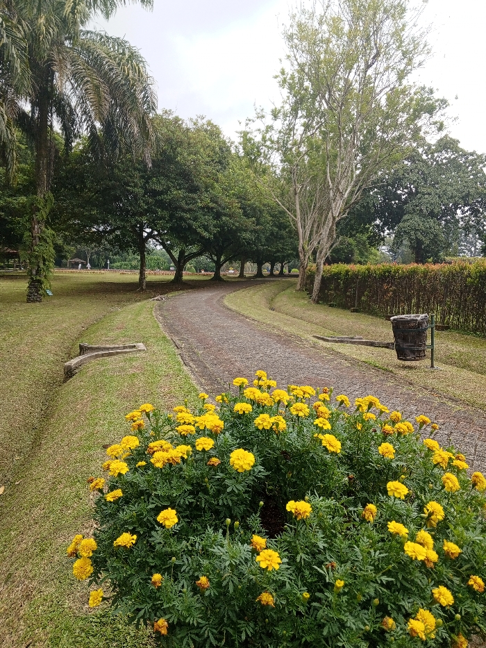 A park path curves through greenery. Yellow flowers bloom prominently in the foreground. Trees of varying types line the path, with a row of hedges marking a boundary on one side. A rustic trash receptacle stands near the path. A building structure can be seen in the distance. The sky is overcast, suggesting a cloudy day.