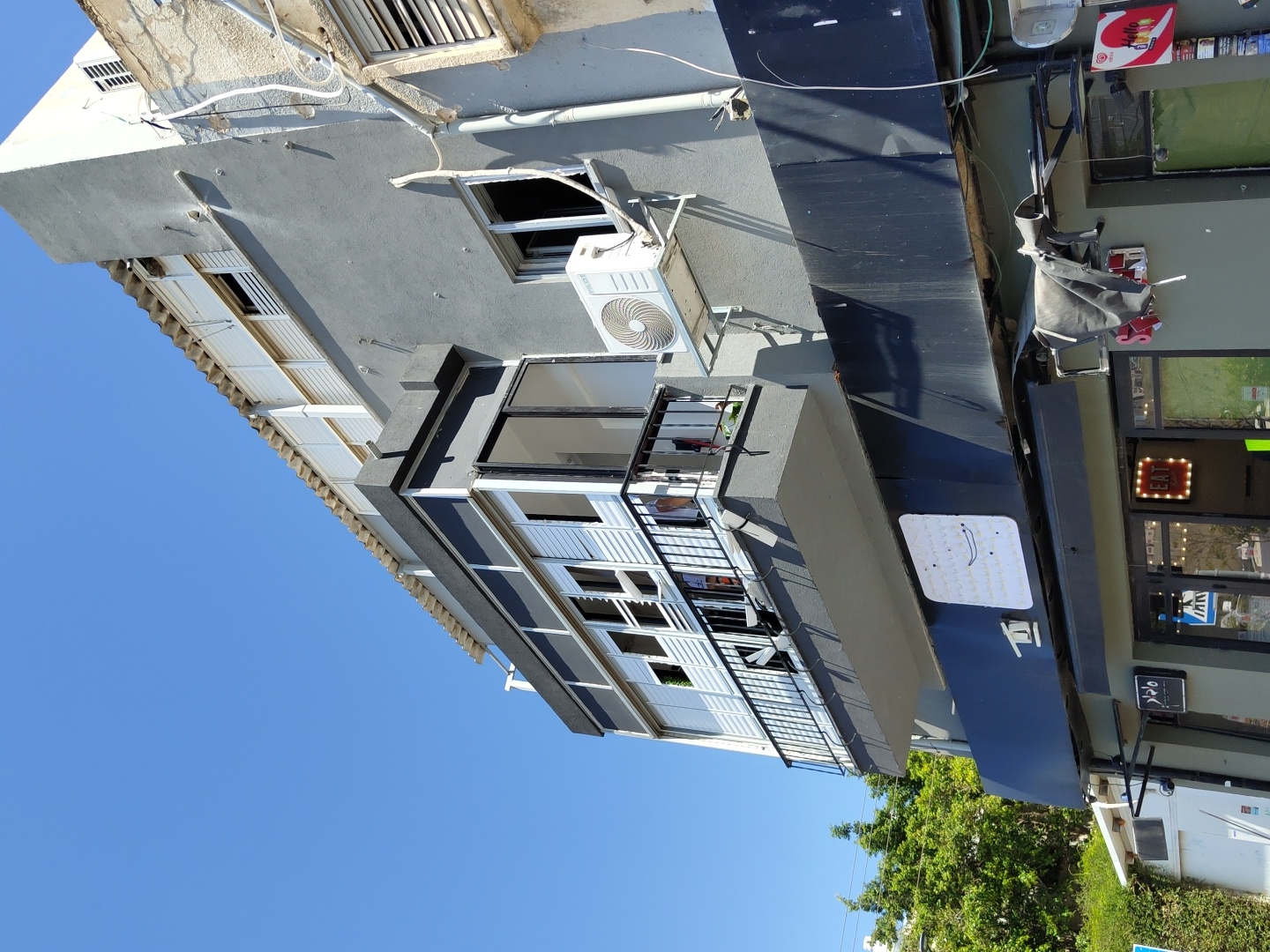 This image depicts the facade of a multi-story building located in Givatayim, Israel, under a clear blue sky. The building features commercial establishments on the ground floor and residential units above. The ground level, from left to right, shows a light-colored wall with green foliage to its immediate left. The central section features a dark gray storefront with large glass doors, through which a pedestrian crossing sign is visible. Above the entrance, a sign with Hebrew text reads "פלאפל" (Falafel), and an illuminated red "EAT" sign is visible within the shop's interior. A prominent black awning extends over this section, from which a dark, torn fabric hangs on the right. Directly above the black awning, a white rectangular sign with a grid pattern and a smiling face is mounted on a black facade element. To the far right, another commercial storefront is partially visible, featuring a red "Hello" sign with an ice cream cone logo. Above the ground floor, a large, enclosed balcony or sunroom dominates the first residential level. It is constructed with white louvered windows and black-framed glass panels, one of which is open. Below this enclosure is a small, open balcony with a black metal railing. On the gray-painted wall to the right of the balcony, a white external air conditioning unit is mounted below an open window. Above this, another window is visible. The top section of the building, on the far right, reveals an older, rough-textured wall of an adjacent structure with a window featuring horizontal blinds. Numerous white pipes and conduits are visible running vertically and horizontally across the building's gray exterior. The uppermost part of the main building features a light-colored top floor or attic area with horizontal louvered windows. No people are visible, and no active interactions or specific actions are depicted. The scene is illuminated by natural daylight.