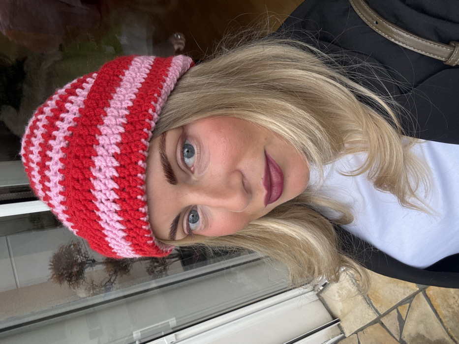 A woman with blonde hair, blue eyes, and carefully applied makeup, including dark red eyeliner on the lower lash line, prominent cheek blush, and dark red lipstick, is depicted in a chest-up portrait. She wears a crocheted beanie featuring alternating horizontal stripes of red and light pink. Her attire includes a white top beneath a dark blazer, with a dark olive-green bag strap visible on her right shoulder. The background features a reflective glass surface, which reflects a leafless tree or shrub and an interior space with warm illumination. Irregular light-colored stone paving is visible on the ground to the left of the subject. The scene is located in Rueil-Malmaison, France.