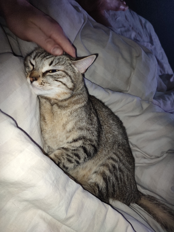 - "A tabby cat lies nestled among white bedding, its eyes squinted shut in contentment" by FM-sBAuS2, licensed under CC BY 4.0