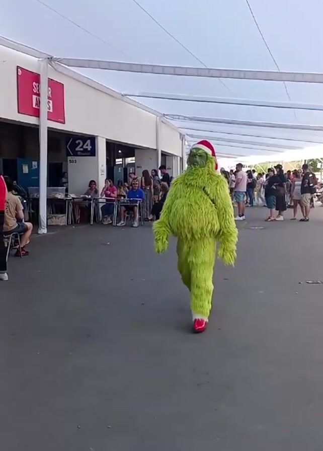 A person in a green Grinch costume, complete with a red Santa hat and red shoes, walks toward the camera. The person is on a gray ground under a white tented area. In the background, there is a building with a red sign that says "SETOR ARTS". There are people sitting at tables and standing around in groups.