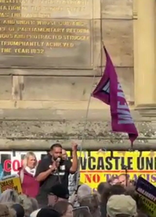 crowd of people gathered at an outdoor rally or protest. A man with dark hair, dark skin, and a beard stands at a microphone addressing the crowd. He is wearing a black t-shirt with white text. A purple flag with the text "WE ARE" in white letters is seen behind him. Some people are holding signs, with visible signs including ones that say "SMASH FASCISM", "NEWCASTLE UNITED", and "NO TO RACISM". The crowd is made up of a mix of ages and genders. The background includes a stone building with engraved text.