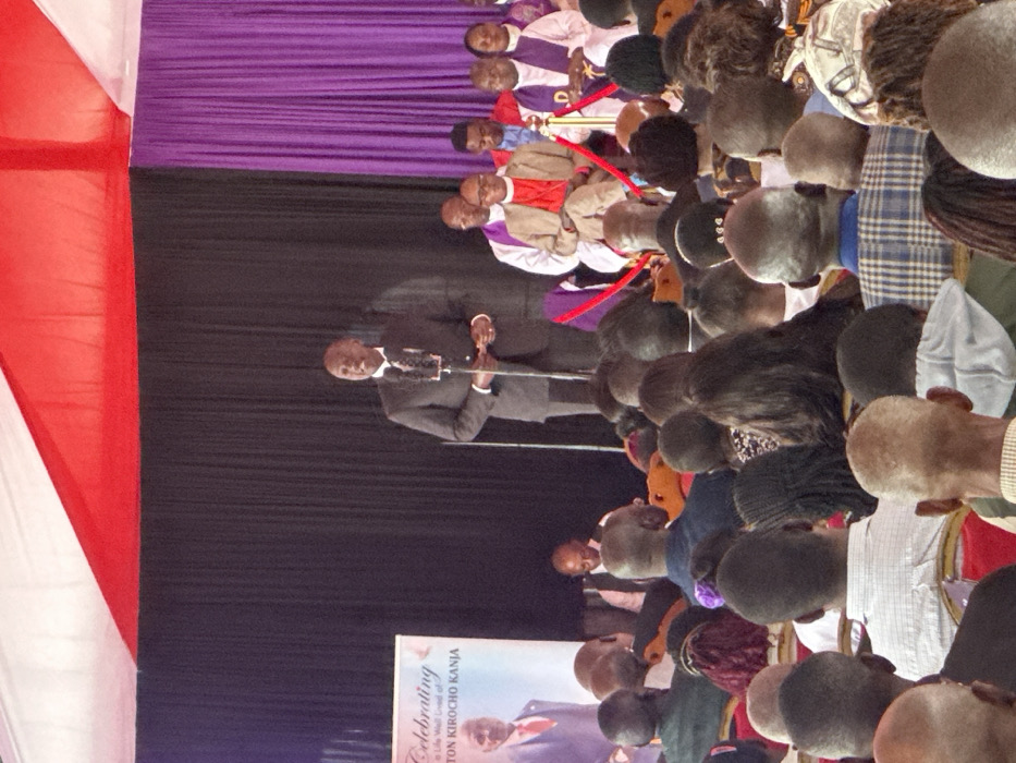 An indoor event is captured from the perspective of the audience, focusing on a stage and the people on it in the city of Unknown, Kenya. A Black male speaker, dressed in a dark suit, white collared shirt, and light tie, stands at a microphone stand addressing the attendees. To his left, a white banner or poster is visible, bearing the partially legible text "Celebrating," "in Life Well Lived of," and "TON KIROCHO KANJA," accompanied by a portrait of another Black male in a light suit. Behind the speaker, several individuals, primarily Black males, are seated on red and gold chairs. At least five of these individuals wear religious vestments in purple, red, and possibly white. Two red velvet ropes with gold stanchions are positioned on the stage. The stage backdrop consists of black fabric drapes on the left and purple fabric drapes on the right. Above, a red and white fabric canopy forms the ceiling structure. The foreground and midground are filled with the backs of numerous seated audience members, predominantly Black, varying in age and attire, attentively facing the stage.