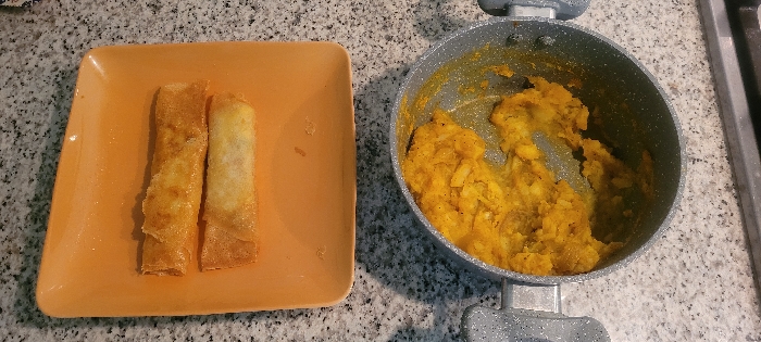 An orange square plate holds two spring rolls, one golden brown and slightly crumpled, the other lighter in color. Adjacent to the plate, a pot on a stove top contains a yellow, mashed mixture, possibly a filling for the spring rolls. The countertop is a speckled gray and white. A section of a black stove element is visible to the right of the pot.