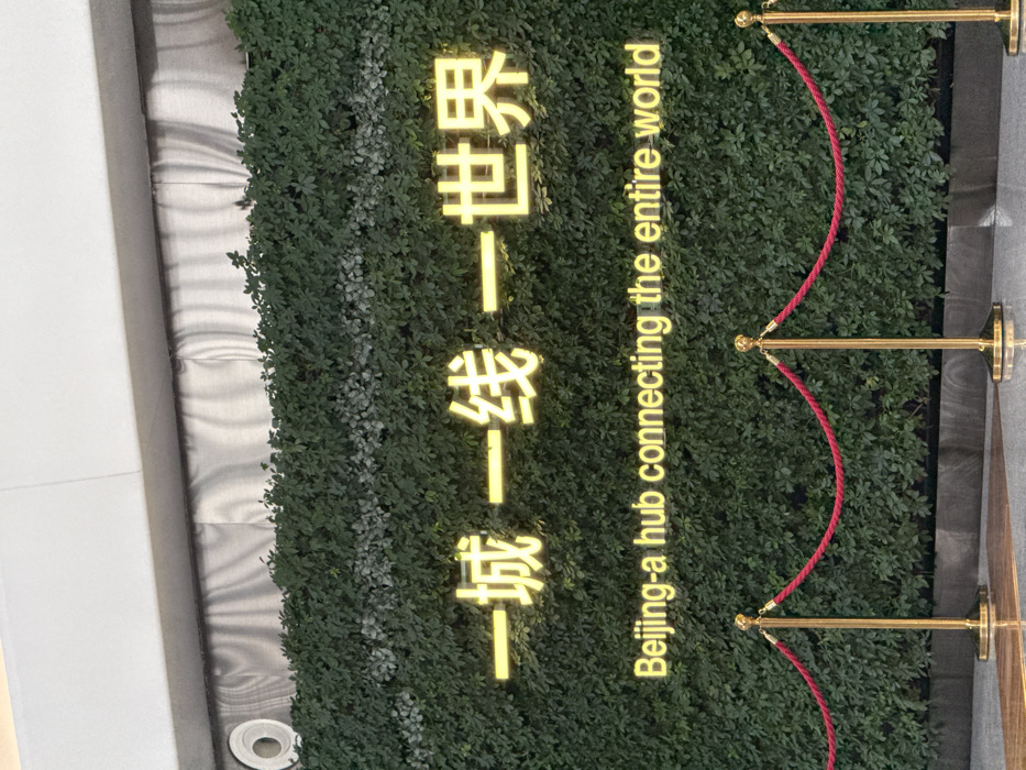 An indoor scene within Beijing Daxing International Airport, located partially in Langfang, China, depicts a large decorative wall