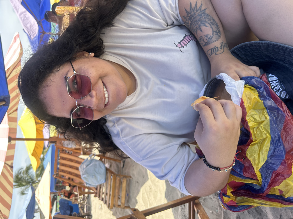 A female subject is depicted from the waist up, seated on a sandy beach in General Villamil Playas, Ecuador. She has dark, long, wavy hair and is wearing hexagonal, pink-tinted sunglasses and a light-colored, short-sleeved t-shirt with a small pink centipede graphic on the left chest. Her left forearm displays a prominent tattoo featuring a sun and moon motif with additional script. A black beaded bracelet and a red string bracelet are visible on her left wrist. She smiles directly at the camera. Her right hand holds a piece of light-colored food, possibly bread, over an open container wrapped in a white plastic bag, which is held in her left hand. A multicolored plastic bag (red, yellow, blue stripes) rests beside her left side, partially obscuring the container, and a dark bucket hat is visible near her left leg. The background features a vibrant beach scene with multiple colorful umbrellas (striped orange/white, yellow, blue, purple) providing shade, along with several wooden beach loungers. Other indistinct figures are present in the distance. The setting suggests clear, bright daylight.